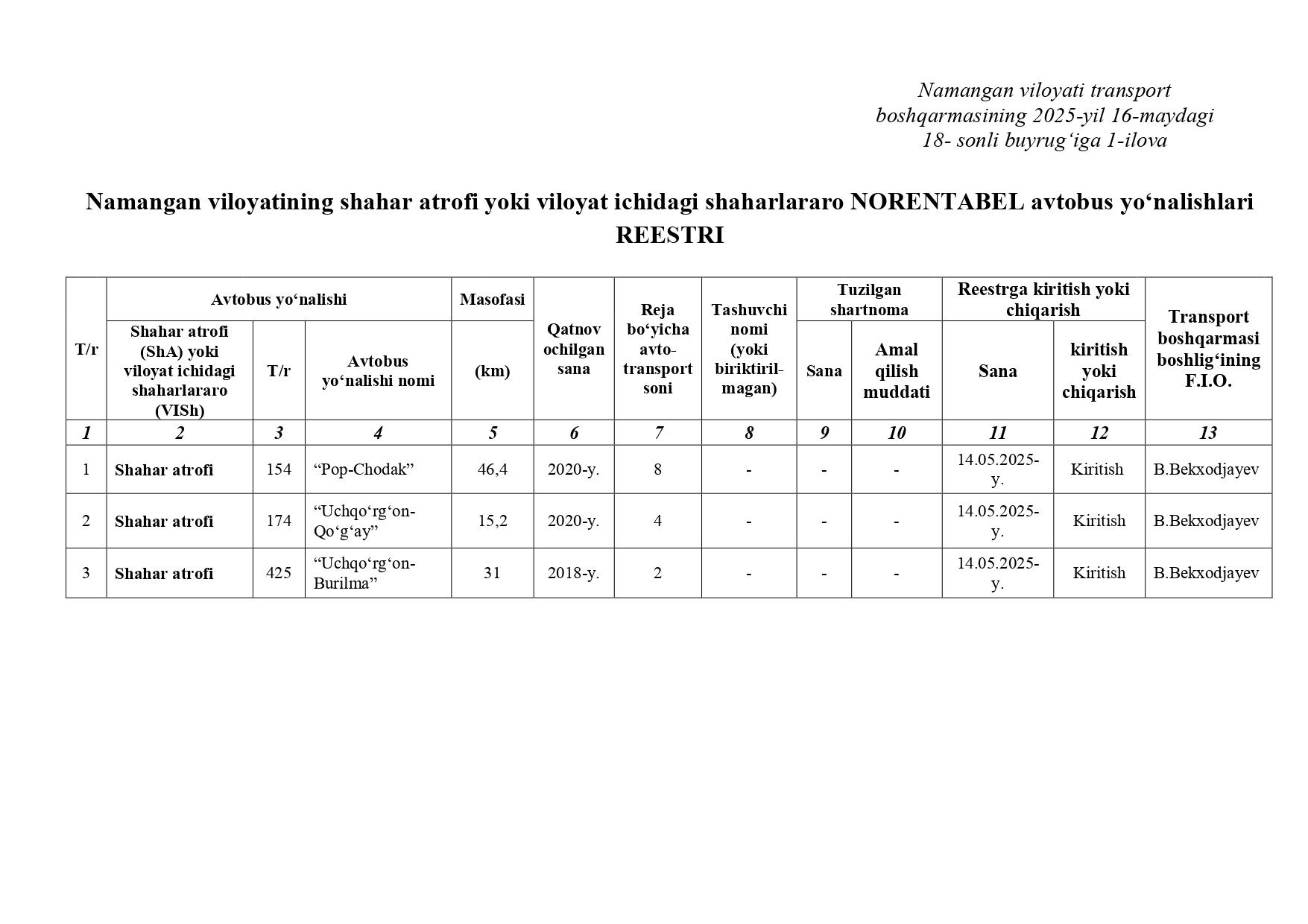 Namangan viloyatining shahar atrofi yoki viloyat ichidagi shaharlararo NORENTABEL avtobus yo‘nalishlari REESTRI