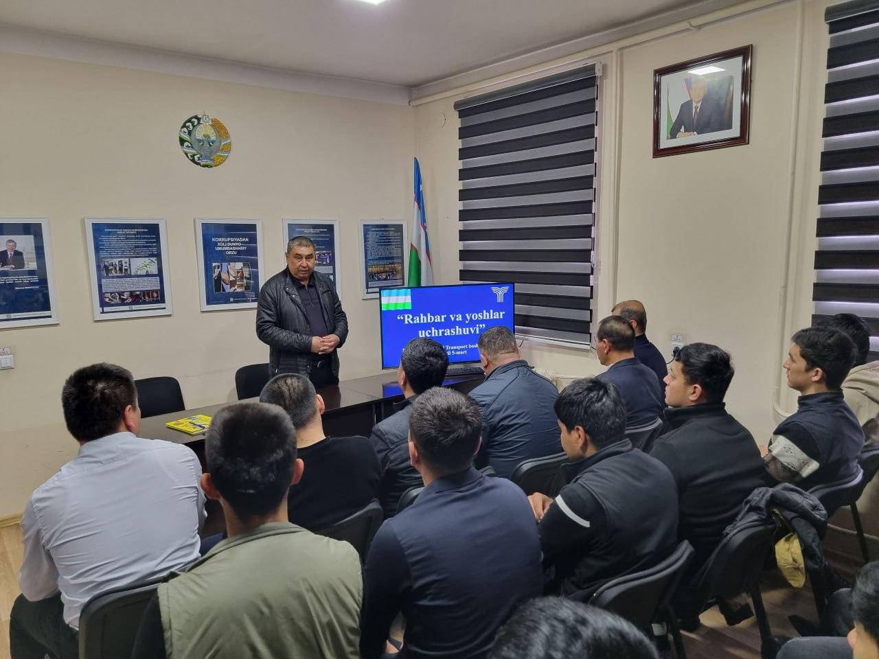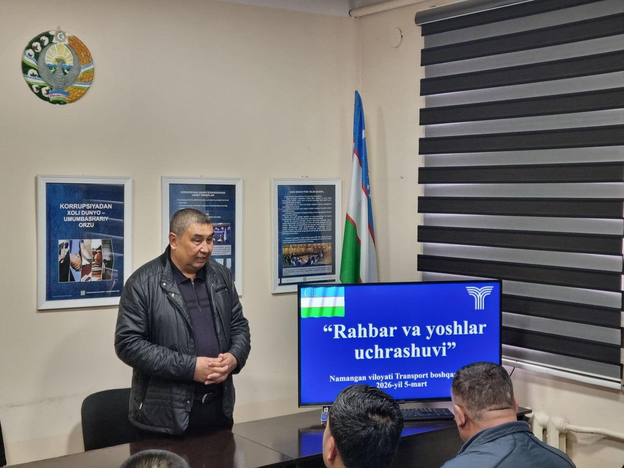 O‘zbekiston Respublikasi Prezidenti SH.M.Mirziyoyevning 2026-yil 24-fevralda yoshlar bilan uchrashuvida haftaning har payshanba kuni vazirlik, idora va tashkilotlarda “Yoshlar kuni” sifatida belgilandi. Shu munosabat bilan Namangan viloyati Transport boshqarmasi boshlig‘i B.Bekxodjayev boshchiligida joylarda yoshlar bilan uchrashuv va ochiq muloqotlar hamda boshqa turli madaniy tadbirlar tashkil etilmoqda.